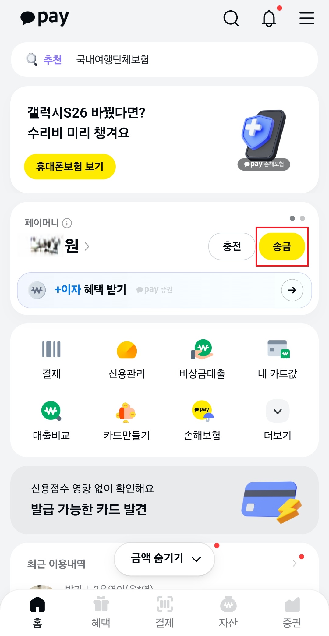 - 송금 버튼 누르기: 잔액이 크게 보이는 화면이 나타나면, 바로 아래에 있는 '송금' 버튼을 누른다.