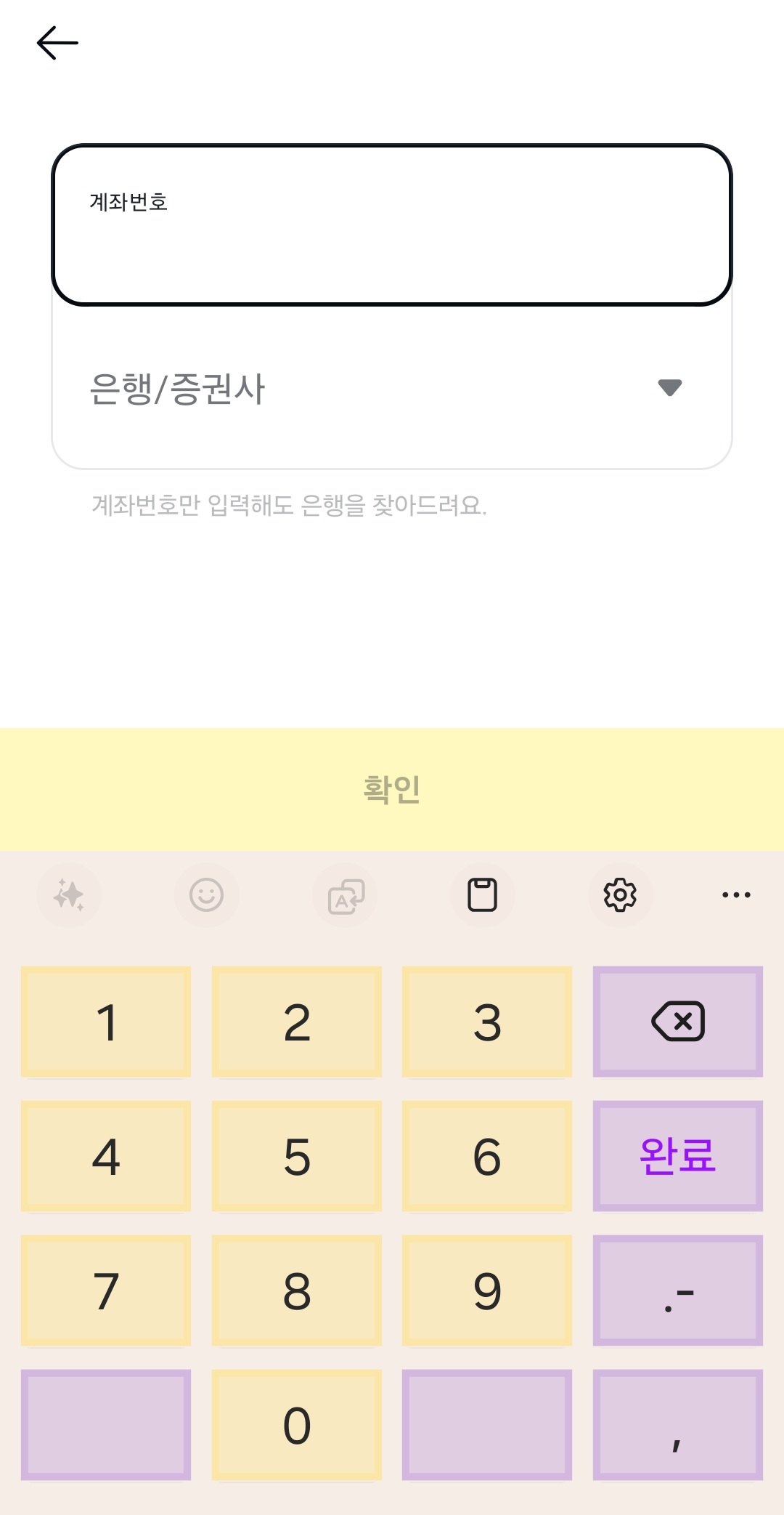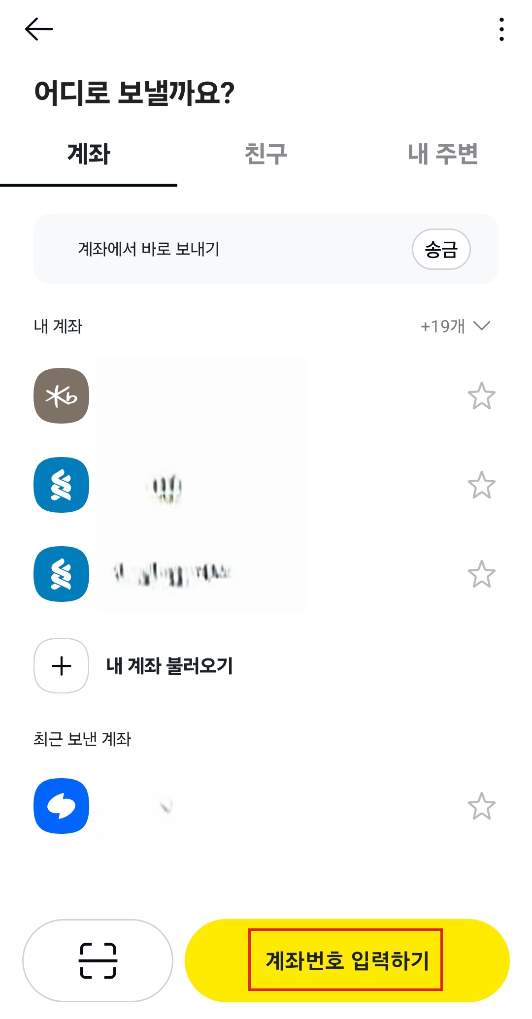 - 내 통장 정보 입력하기: 화면 위쪽에서 '계좌번호'를 선택한다. 내가 돈을 받을 은행(예: 농협, 국민, 신한 등)을 고르고, 내 주거래 통장 계좌번호를 숫자로 입력한다.